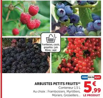 Actuellement, Arbustes petits fruits est en promotion chez Super U. Toutes les informations utiles comme le prix, les conditions et la durée de validité sont affichées sur cette page. Consultez également les promotions similaires pour Arbustes petits fruits, afin de faire le meilleur choix. La promo Arbustes petits fruits est valable du 24-02-2026 au 22-03-2026. Si elle est expirée, regardez les autres offres équivalentes. Vous pouvez aussi suivre cette catégorie de produit pour être alerté lorsqu’une nouvelle promotion Arbustes petits fruits apparaît chez Super U.Questions fréquemment posées au sujet de Arbustes petits fruits