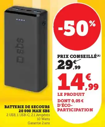 Le prix de l'offre Batterie de secours 20 000 mah sbs se trouve également en haut de la page, ainsi que la date à laquelle l'offre est disponible. Vous pouvez également vérifier les prix dans le Catalogue Super U actuel ou sur le site Internet de Super U. Les offres vous permettent d'acheter les produits Super U au prix le plus bas.