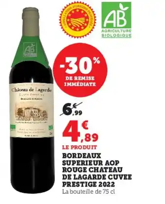 Actuellement en offre chez Super U : Bordeaux superieur aop rouge chateau de lagarde cuvee prestige 2022 ✅ Valable du 20-01 au 1-02.