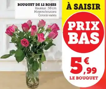 En plus de l'offre Bouquet de 12 roses, Super U propose une large gamme de produits. Consultez le Catalogue Super U hebdomadaire pour découvrir les meilleures offres et promotions. En plus de Bouquet de 12 roses, il y a aussi : Bouquet de 12 roses, Bouquet de 12 roses & Bouquet de 10 roses.