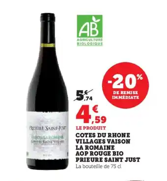 Cotes du rhone villages vaison la romaine aop rouge bio prieure saint just 75 cl