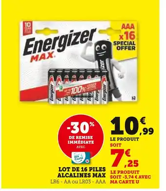 Offre Energizer lot de 16 piles alcalines max chez Super U