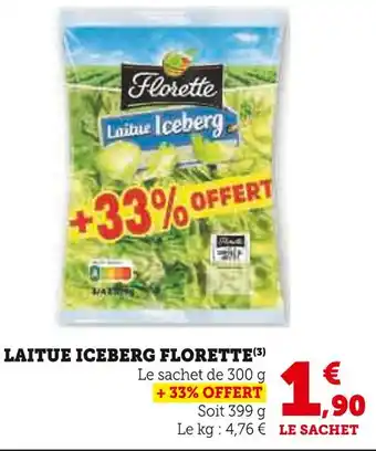 En plus de l'offre Florette laitue iceberg, Super U propose une large gamme de produits. Consultez le Catalogue Super U hebdomadaire pour découvrir les meilleures offres et promotions. En plus de Florette laitue iceberg, il y a aussi : FLORETTE Laitue iceberg, Florette maxi iceberg florette & FLORETTE Coeur de laitue.