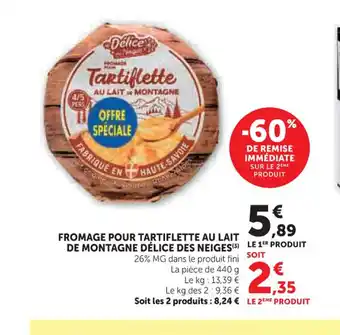Actuellement en offre chez Super U : Fromage pour tartiflette au lait de montagne délice des neiges ✅ Valable du 24-02 au 8-03.