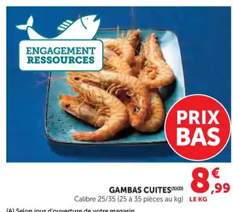 Actuellement, Gambas cuites est en promotion chez Super U. Toutes les informations utiles comme le prix, les conditions et la durée de validité sont affichées sur cette page. Consultez également les promotions similaires pour Gambas cuites, afin de faire le meilleur choix. La promo Gambas cuites est valable du 24-02-2026 au 08-03-2026. Si elle est expirée, regardez les autres offres équivalentes. Vous pouvez aussi suivre cette catégorie de produit pour être alerté lorsqu’une nouvelle promotion Gambas cuites apparaît chez Super U.Questions fréquemment posées au sujet de Gambas cuites