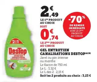 Le prix de l'offre Gel entretien canalisations destop se trouve également en haut de la page, ainsi que la date à laquelle l'offre est disponible. Vous pouvez également vérifier les prix dans le Catalogue Super U actuel ou sur le site Internet de Super U. Les offres vous permettent d'acheter les produits Super U au prix le plus bas.