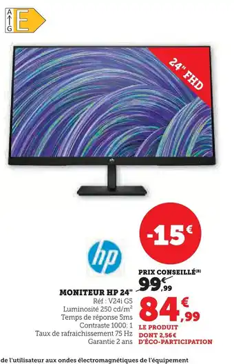 En plus de l'offre HP Moniteur 24", Super U propose une large gamme de produits. Consultez le Catalogue Super U hebdomadaire pour découvrir les meilleures offres et promotions. En plus de HP Moniteur 24", il y a aussi : Hp moniteur hp 24, Hp moniteur hp 24 & HP Moniteur.