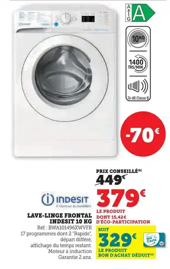 Actuellement, Indesit lave-linge frontal indesit 10 kg est en promotion chez Super U. Toutes les informations utiles comme le prix, les conditions et la durée de validité sont affichées sur cette page. Consultez également les promotions similaires pour Indesit lave-linge frontal indesit 10 kg, afin de faire le meilleur choix. La promo Indesit lave-linge frontal indesit 10 kg est valable du 20-01-2026 au 08-02-2026. Si elle est expirée, regardez les autres offres équivalentes. Vous pouvez aussi suivre cette catégorie de produit pour être alerté lorsqu’une nouvelle promotion Indesit lave-linge frontal indesit 10 kg apparaît chez Super U.Questions fréquemment posées au sujet de Indesit lave-linge frontal indesit 10 kg