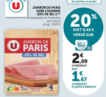 Offre Jambon de paris sans couenne -25% de sel u chez Super U