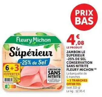 L'offre est disponible dans plusieurs magasins, vérifiez tous les produits pour obtenir le Jambon Le Supérieur -25% de Sel le moins cher. Si vous souhaitez savoir si l'article est en vente avec une plus grosse remise dans un autre magasin, consultez la catégorie 'Supermarché'. Ces offres pourraient aussi vous intéresser : Jambon Le Supérieur -25% de Sel, Jambon le superieur -25% de sel conservation sans nitrite fleury michon & FLEURY MICHON Jambon le superieur -25% de sel conservation sans nitrite.