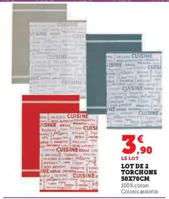 Le prix de l'offre Lot de 2 torchons se trouve également en haut de la page, ainsi que la date à laquelle l'offre est disponible. Vous pouvez également vérifier les prix dans le Catalogue Super U actuel ou sur le site Internet de Super U. Les offres vous permettent d'acheter les produits Super U au prix le plus bas.
