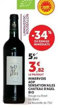Actuellement en offre chez Super U : MINERVOIS AOP SENSATION'AILES CHATEAU D'AGEL BIO ✅ Valable du 28-04 au 10-05.