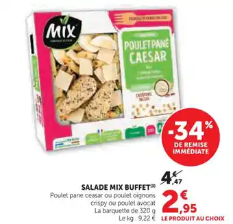 Actuellement, MIX BUFFET Salade est en promotion chez Super U. Toutes les informations utiles comme le prix, les conditions et la durée de validité sont affichées sur cette page. Consultez également les promotions similaires pour MIX BUFFET Salade, afin de faire le meilleur choix. La promo MIX BUFFET Salade est valable du 24-02-2026 au 08-03-2026. Si elle est expirée, regardez les autres offres équivalentes. Vous pouvez aussi suivre cette catégorie de produit pour être alerté lorsqu’une nouvelle promotion MIX BUFFET Salade apparaît chez Super U.Questions fréquemment posées au sujet de MIX BUFFET Salade