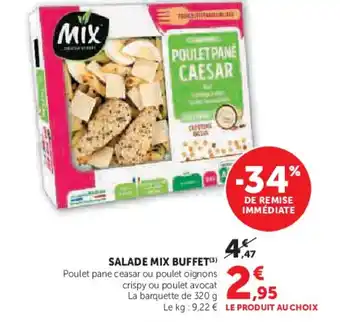 Actuellement, MIX BUFFET Salade est en promotion chez Super U. Toutes les informations utiles comme le prix, les conditions et la durée de validité sont affichées sur cette page. Consultez également les promotions similaires pour MIX BUFFET Salade, afin de faire le meilleur choix. La promo MIX BUFFET Salade est valable du 24-02-2026 au 08-03-2026. Si elle est expirée, regardez les autres offres équivalentes. Vous pouvez aussi suivre cette catégorie de produit pour être alerté lorsqu’une nouvelle promotion MIX BUFFET Salade apparaît chez Super U.Questions fréquemment posées au sujet de MIX BUFFET Salade