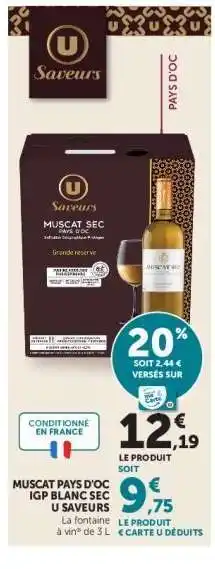 Actuellement en offre chez Super U : MUSCAT PAYS D'OC IGP BLANC SEC U SAVEURS ✅ Valable du 28-04 au 10-05.