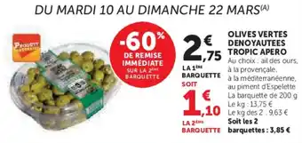 Actuellement en offre chez Super U : Olives vertes denoyautees tropic apero ✅ Valable du 10-03 au 22-03.