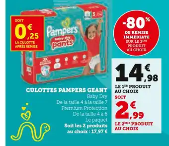 En plus de l'offre Pampers culottes geant, Super U propose une large gamme de produits. Consultez le Catalogue Super U hebdomadaire pour découvrir les meilleures offres et promotions. En plus de Pampers culottes geant, il y a aussi : Pampers - culottes geant, Culottes pampers geant & Culottes pampers geant.