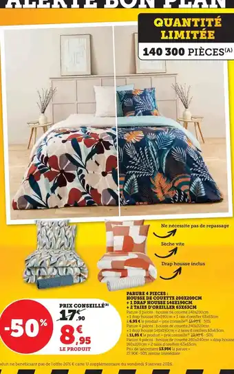 Actuellement en offre chez Super U : Parure 4 pieces: housse de couette + 1 drap housse + 2 taies d'oreiller ✅ Valable du 6-01 au 18-01.