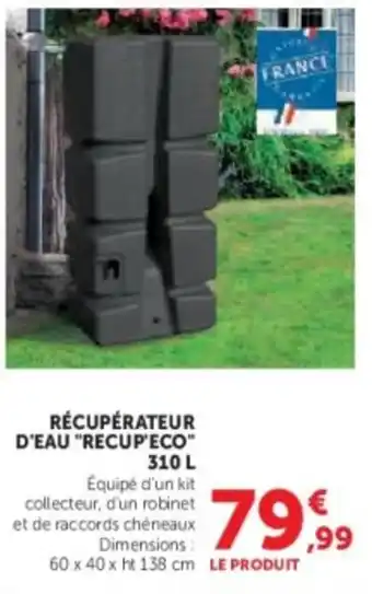Le prix de l'offre Récupérateur d'eau recup'eco se trouve également en haut de la page, ainsi que la date à laquelle l'offre est disponible. Vous pouvez également vérifier les prix dans le Catalogue Super U actuel ou sur le site Internet de Super U. Les offres vous permettent d'acheter les produits Super U au prix le plus bas.