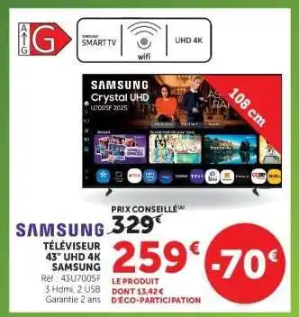 Actuellement en offre chez Super U : SAMSUNG TÉLÉVISEUR 43'' UHD 4K ✅ Valable du 28-04 au 10-05.