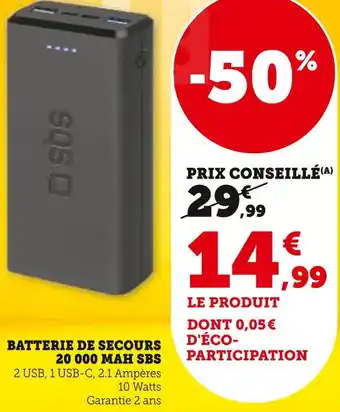 Offre Sbs batterie de secours 20 000 mah chez Super U