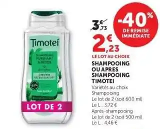 En plus de l'offre Shampooing ou Après Shampooing Timotei, Super U propose une large gamme de produits. Consultez le Catalogue Super U hebdomadaire pour découvrir les meilleures offres et promotions. En plus de Shampooing ou Après Shampooing Timotei, il y a aussi : Shampooing ou Après Shampooing Timotei, TIMOTEI Shampooing ou apres shampooing & Timotei shampooing ou apres shampooing.