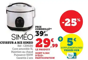 En plus de l'offre Siméo cuiseur à riz, Super U propose une large gamme de produits. Consultez le Catalogue Super U hebdomadaire pour découvrir les meilleures offres et promotions. En plus de Siméo cuiseur à riz, il y a aussi : Simeo cuiseur a riz simeo, SIMEO Cuiseur a riz & Simeo - cuiseur a riz crm180.