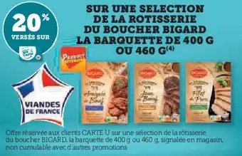 Actuellement en offre chez Super U : SUR UNE SELECTION DE LA ROTISSERIE DU BOUCHER BIGARD LA BARQUETTE DE 400 G OU 460 G ✅ Valable du 6-01 au 18-01.