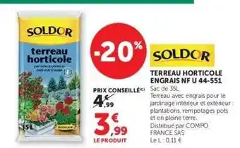 En plus de l'offre TERREAU HORTICOLE ENGRAIS NF U 44-551, Super U propose une large gamme de produits. Consultez le Catalogue Super U hebdomadaire pour découvrir les meilleures offres et promotions. En plus de TERREAU HORTICOLE ENGRAIS NF U 44-551, il y a aussi : TERREAU HORTICOLE ENGRAIS NFU 44-551, ALGOFLASH Terreau horticole & SOLDOR Terreau horticole.