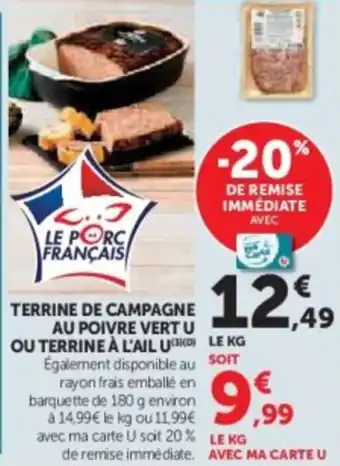 Actuellement en offre chez Super U : Terrine de campagne au poivre vert u ou terrine à l'ail u ✅ Valable du 17-03 au 29-03.