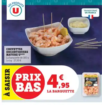 En plus de l'offre U crevettes décortiquées nature, Super U propose une large gamme de produits. Consultez le Catalogue Super U hebdomadaire pour découvrir les meilleures offres et promotions. En plus de U crevettes décortiquées nature, il y a aussi : GOLDEN SEAFOOD Crevettes décortiquées nature, Crevettes décortiquées cuites réfrigérées & DELPIERRE Crevettes décortiquées ASC.