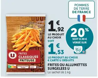 L'offre est disponible dans plusieurs magasins, vérifiez tous les produits pour obtenir le U Frites ou allumettes surgelees le moins cher. Si vous souhaitez savoir si l'article est en vente avec une plus grosse remise dans un autre magasin, consultez la catégorie 'Supermarché'. Ces offres pourraient aussi vous intéresser : U frites ou allumettes surgelées, U Frites ou allumettes surgelees & Frites ou allumettes surgelees u.