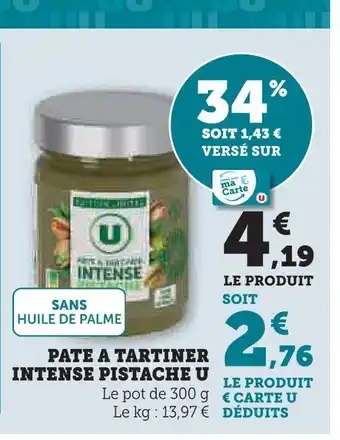 En plus de l'offre U pate a tartiner intense pistache, Super U propose une large gamme de produits. Consultez le Catalogue Super U hebdomadaire pour découvrir les meilleures offres et promotions. En plus de U pate a tartiner intense pistache, il y a aussi : U Pate a tartiner intense pistache, U Pate a tartiner intense pistache & U Pate a tartiner intense pistache.