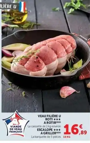 Actuellement, Veau Filière U Rôti est en promotion chez Super U. Toutes les informations utiles comme le prix, les conditions et la durée de validité sont affichées sur cette page. Consultez également les promotions similaires pour Veau Filière U Rôti, afin de faire le meilleur choix. La promo Veau Filière U Rôti est valable du 21-04-2026 au 03-05-2026. Si elle est expirée, regardez les autres offres équivalentes. Vous pouvez aussi suivre cette catégorie de produit pour être alerté lorsqu’une nouvelle promotion Veau Filière U Rôti apparaît chez Super U.Questions fréquemment posées au sujet de Veau Filière U Rôti