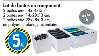L'offre est disponible dans plusieurs magasins, vérifiez tous les produits pour obtenir le Lot de boîtes de rangement le moins cher. Si vous souhaitez savoir si l'article est en vente avec une plus grosse remise dans un autre magasin, consultez la catégorie 'Bazar et Déstockage'. Ces offres pourraient aussi vous intéresser : Lot de boîtes de rangement 31x55x20 cm, Lot de 3 boîtes de rangement & Lot de 6 boites de rangement pour dressing.