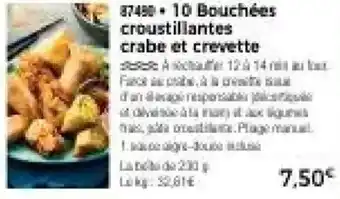 L'offre est disponible dans plusieurs magasins, vérifiez tous les produits pour obtenir le 10 Bouchées croustillantes crabe et crevette le moins cher. Si vous souhaitez savoir si l'article est en vente avec une plus grosse remise dans un autre magasin, consultez la catégorie 'Supermarché'. Ces offres pourraient aussi vous intéresser : 12 Bouchées croustillantes, Assortiment de bouchées vapeur à la crevette & Fines et +2 croustillantes.