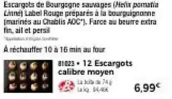 L'offre est disponible dans plusieurs magasins, vérifiez tous les produits pour obtenir le 12 Escargots calibre moyen le moins cher. Si vous souhaitez savoir si l'article est en vente avec une plus grosse remise dans un autre magasin, consultez la catégorie 'Supermarché'. Ces offres pourraient aussi vous intéresser : 36 Escargots calibre moyen, 36 Escargots calibre belle grosseur & LOUE Oeufs de poule plein air calibre moyen igp label rouge les fermiers.