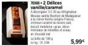 L'offre est disponible dans plusieurs magasins, vérifiez tous les produits pour obtenir le 2 Délices vanille,caramel le moins cher. Si vous souhaitez savoir si l'article est en vente avec une plus grosse remise dans un autre magasin, consultez la catégorie 'Supermarché'. Ces offres pourraient aussi vous intéresser : 4 délices vanille,caramel, Delices au caramel & Vanille,caramel.