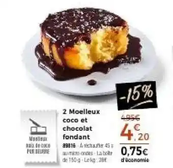 L'offre est disponible dans plusieurs magasins, vérifiez tous les produits pour obtenir le 2 Moelleux coco et chocolat fondant le moins cher. Si vous souhaitez savoir si l'article est en vente avec une plus grosse remise dans un autre magasin, consultez la catégorie 'Supermarché'. Ces offres pourraient aussi vous intéresser : Moelleux au chocolat, 2 moelleux chocolat & Moelleux au chocolat.