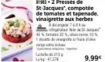 Le prix de l'offre 2 Pressés de St-Jacques, compotée de tomates et tapenade, vinaigrette aux herbes se trouve également en haut de la page, ainsi que la date à laquelle l'offre est disponible. Vous pouvez également vérifier les prix dans le Catalogue Thiriet actuel ou sur le site Internet de Thiriet. Les offres vous permettent d'acheter les produits Thiriet au prix le plus bas.