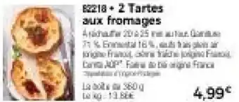 L'offre est disponible dans plusieurs magasins, vérifiez tous les produits pour obtenir le 2 tartes aux fromages le moins cher. Si vous souhaitez savoir si l'article est en vente avec une plus grosse remise dans un autre magasin, consultez la catégorie 'Supermarché'. Ces offres pourraient aussi vous intéresser : 2 tartes aux fromages, Tartes renversées & Quiches et tartes.