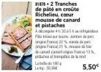 Offre 2 tranches de pâté en croûte richelieu, cœur mousse de canard et pistaches chez Thiriet