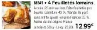 L'offre est disponible dans plusieurs magasins, vérifiez tous les produits pour obtenir le 4 Feuilletés lorrains le moins cher. Si vous souhaitez savoir si l'article est en vente avec une plus grosse remise dans un autre magasin, consultez la catégorie 'Supermarché'. Ces offres pourraient aussi vous intéresser : 40 Petits feuilletés, 30 Mini feuilletés & 10 Feuilletés emmental.