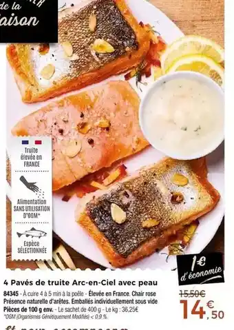 L'offre est disponible dans plusieurs magasins, vérifiez tous les produits pour obtenir le 4 pavés de truite arc-en-ciel avec peau le moins cher. Si vous souhaitez savoir si l'article est en vente avec une plus grosse remise dans un autre magasin, consultez la catégorie 'Supermarché'. Ces offres pourraient aussi vous intéresser : Truite rose arc en ciel vidée 200/300 engagement qualité restauration promocash, Quo vadis - calendrier arc-en-ciel & Filets de truite avec peau SIMPL.