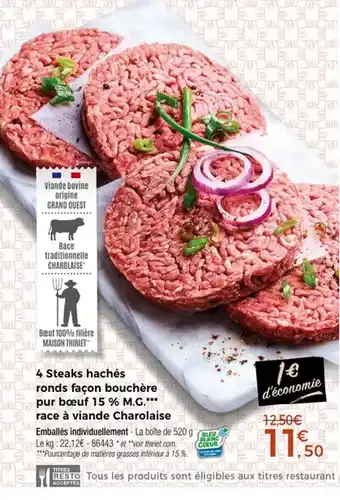 4 steaks hachés ronds façon bouchère pur bœuf 15 % m.g. race à viande charolaise offres et promotions en ligne chez Thiriet