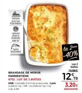L'offre est disponible dans plusieurs magasins, vérifiez tous les produits pour obtenir le Brandade de morue parmentière le moins cher. Si vous souhaitez savoir si l'article est en vente avec une plus grosse remise dans un autre magasin, consultez la catégorie 'Supermarché'. Ces offres pourraient aussi vous intéresser : Brandade de morue parmentière, Brandade de morue parmentière & Brandade de morue parmentière.