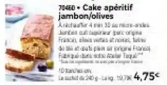 L'offre est disponible dans plusieurs magasins, vérifiez tous les produits pour obtenir le Cake apéritif jambon,olives le moins cher. Si vous souhaitez savoir si l'article est en vente avec une plus grosse remise dans un autre magasin, consultez la catégorie 'Supermarché'. Ces offres pourraient aussi vous intéresser : Cake jambon et olives, Cake jambon olives & CAKE JAMBON OLIVES.
