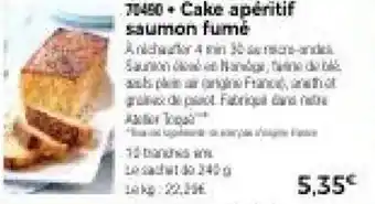 L'offre est disponible dans plusieurs magasins, vérifiez tous les produits pour obtenir le Cake apéritif saumon fumé le moins cher. Si vous souhaitez savoir si l'article est en vente avec une plus grosse remise dans un autre magasin, consultez la catégorie 'Supermarché'. Ces offres pourraient aussi vous intéresser : Cake apéritif, Saumon fumé & Labeyrie - saumon fumé.