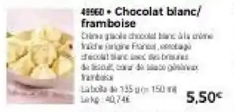 Le prix de l'offre Chocolat blanc,framboise se trouve également en haut de la page, ainsi que la date à laquelle l'offre est disponible. Vous pouvez également vérifier les prix dans le Catalogue Thiriet actuel ou sur le site Internet de Thiriet. Les offres vous permettent d'acheter les produits Thiriet au prix le plus bas.