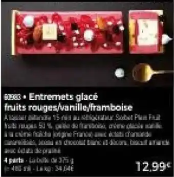Le prix de l'offre Entremets glacé fruits rouges,vanille,framboise se trouve également en haut de la page, ainsi que la date à laquelle l'offre est disponible. Vous pouvez également vérifier les prix dans le Catalogue Thiriet actuel ou sur le site Internet de Thiriet. Les offres vous permettent d'acheter les produits Thiriet au prix le plus bas.